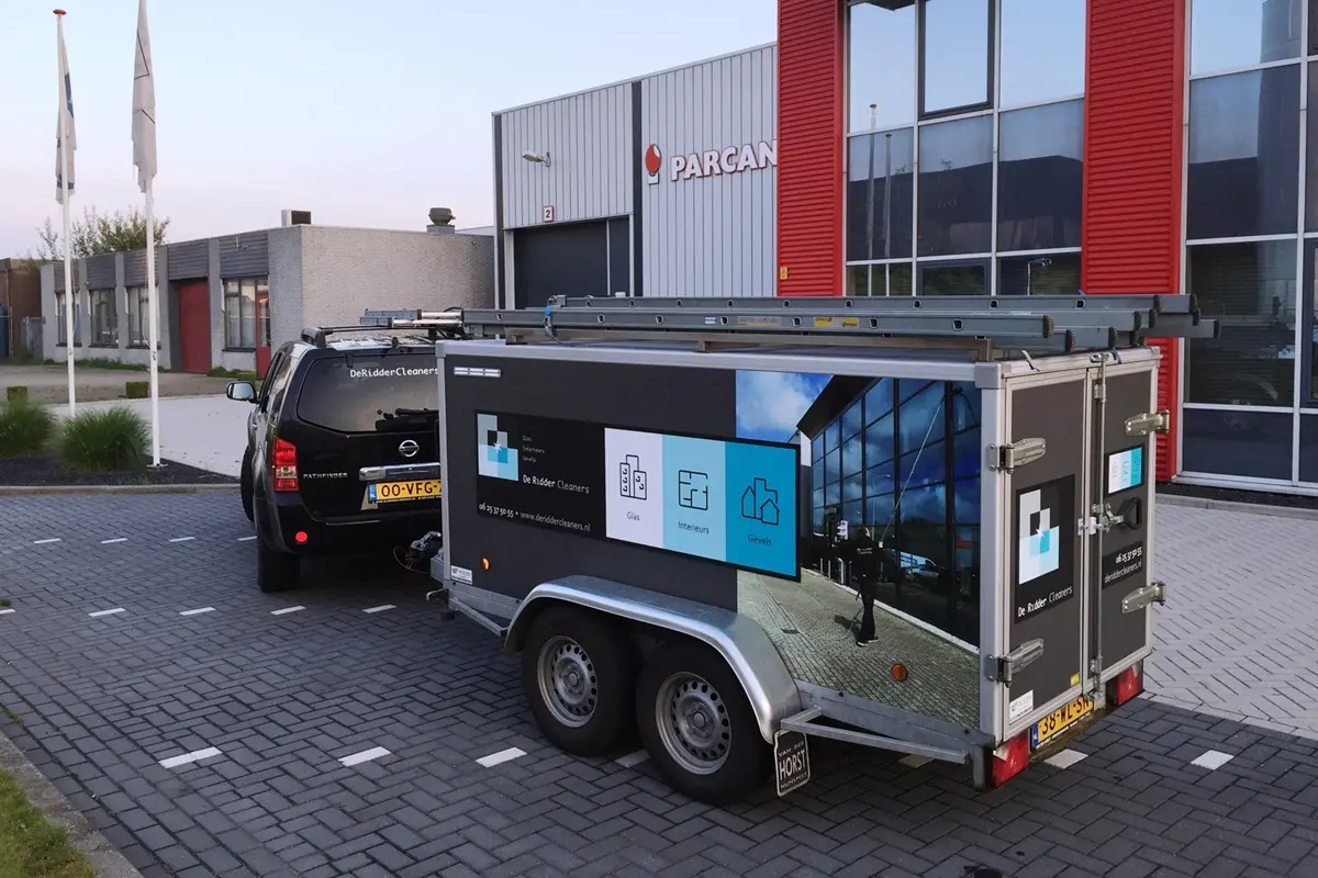 De Ridder Cleaners heeft een nieuwe aanhanger op maat laten maken met een dubbel warmwater telescoopsysteem. Dit systeem maakt al uw gevelglas weer blinkend schoon en maakt gevelbekleding weer netjes en fris!