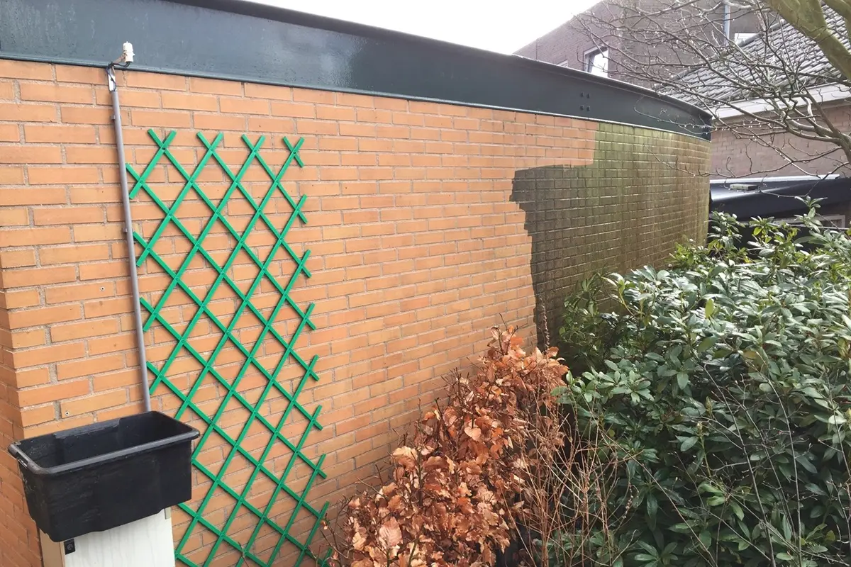Groene algen aanslag kan je op verschillende manieren verwijderen. Deze muren lenen zich bij uitstek om onder lichte druk gereinigd te worden. Alsof we aan het schilderen zijn!